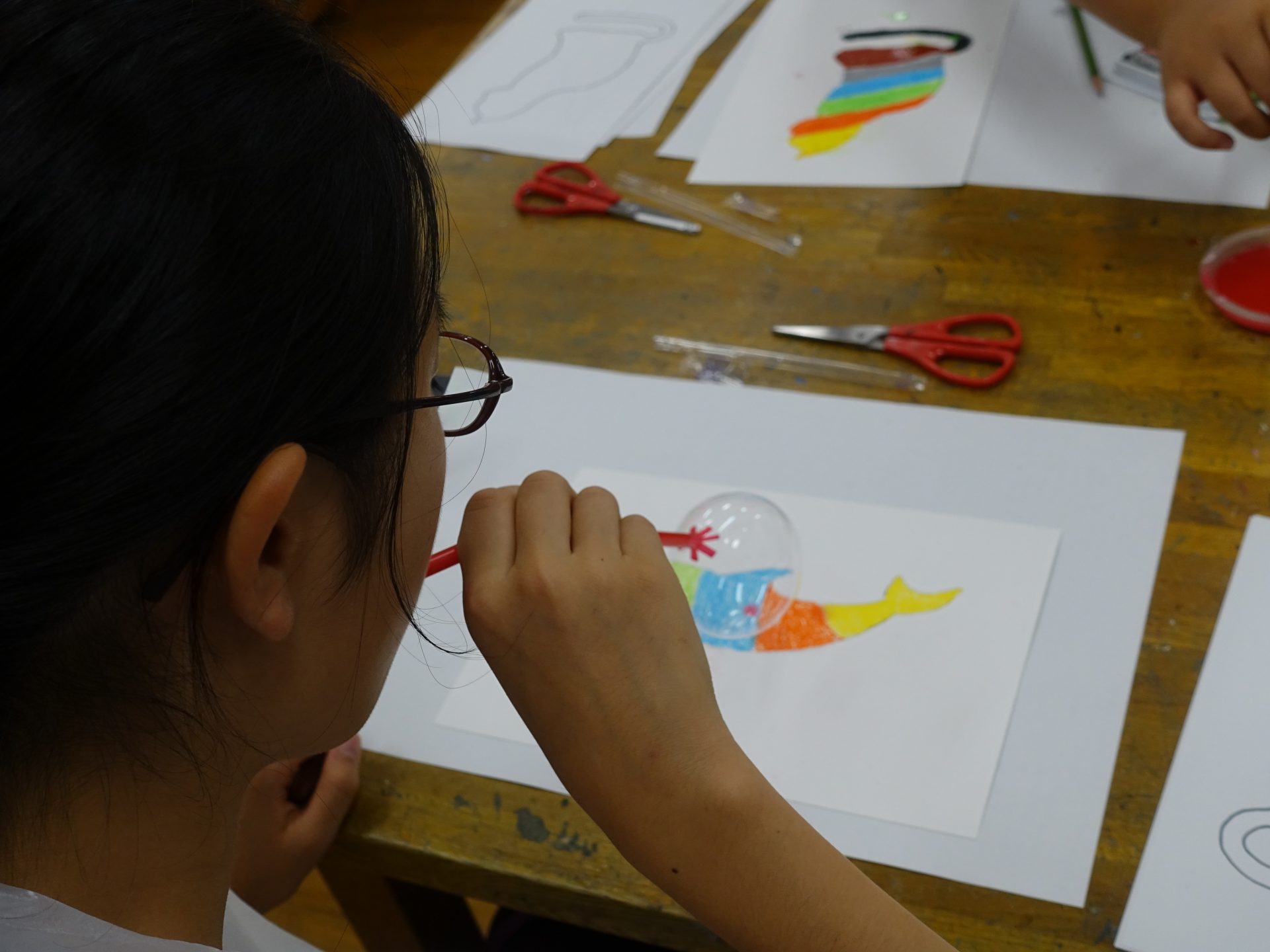 クレパスで色を塗った紙に、色をつけたシャボン玉を飛ばして模様を描きました。予想できない模様ができるのを、受験生の皆さんも楽しんだようです。