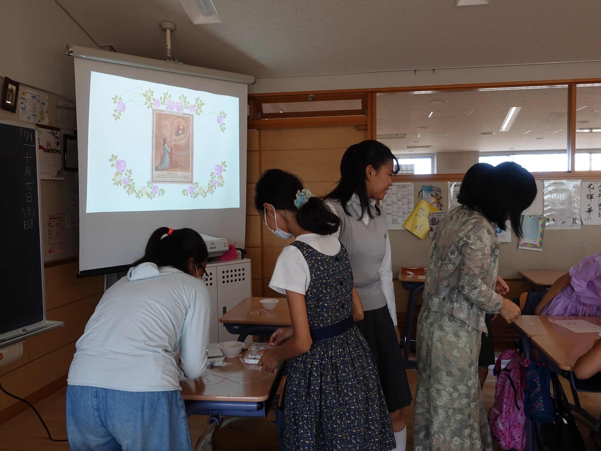 宗教では、ロザリオ作りを実施しました。ロザリオは本校が大切にしている、聖母マリアが教えて下さった祈りの道具です。ロザリオやマリア様について説明した上で、中学3年生と一緒に、かわいいロザリオができました。当初は1つの予定でしたが、参加した受験生の皆さんが一生懸命取り組んだので、2つめを作ることが出来た人もいました。