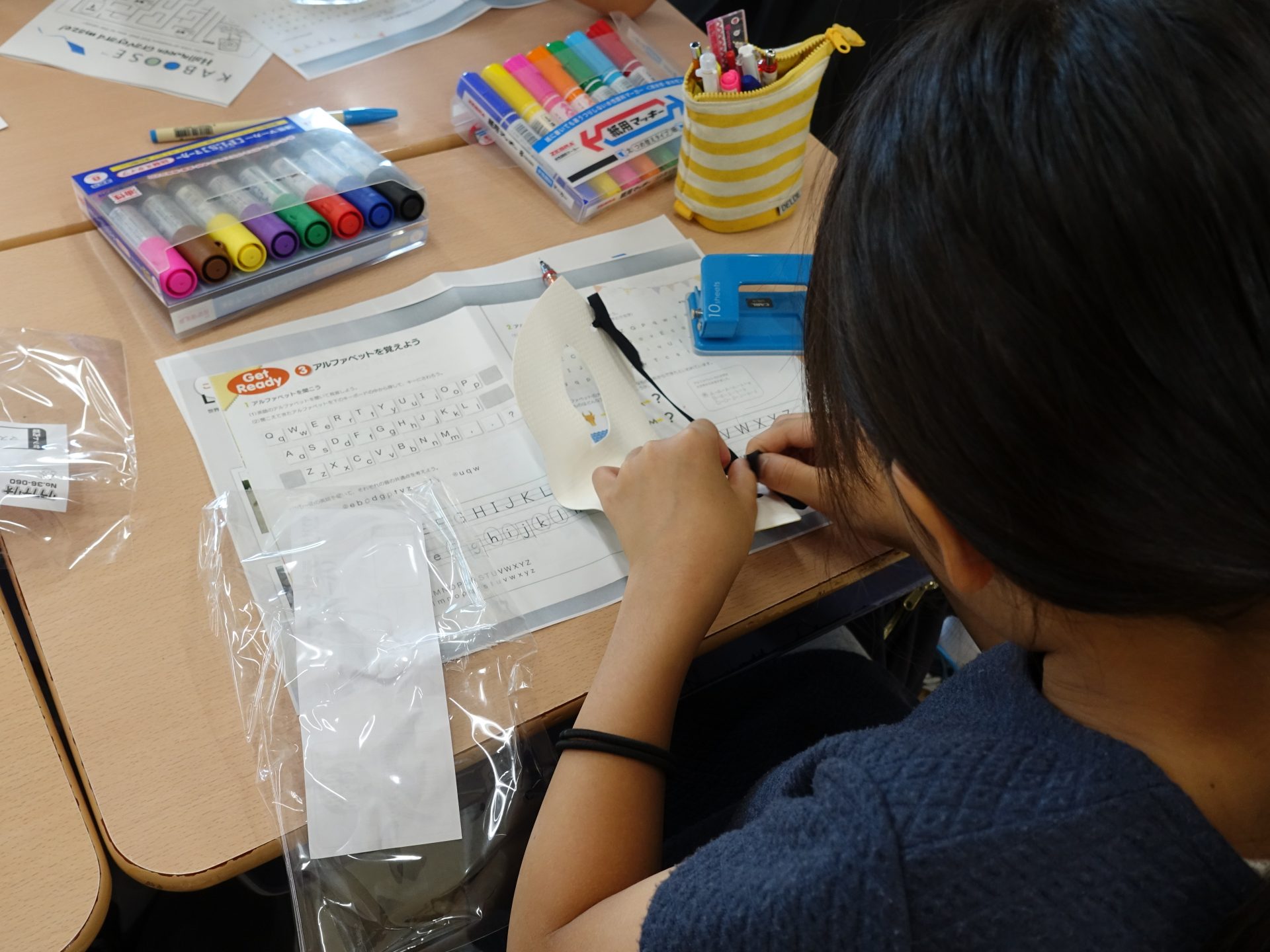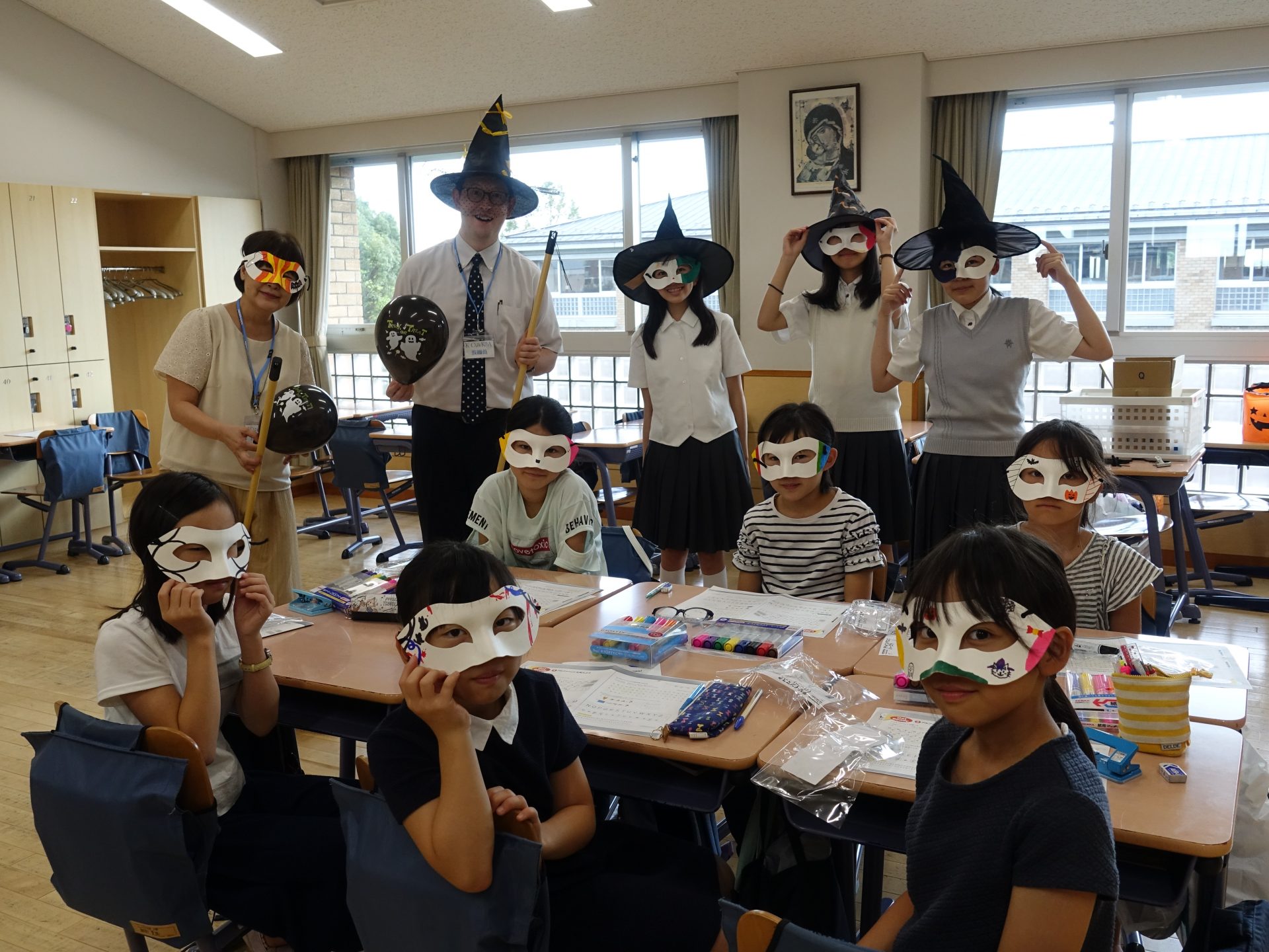マスク作りや、ビンゴ、ほうきで風船を運ぶなどをして、楽しく英語を学べました。