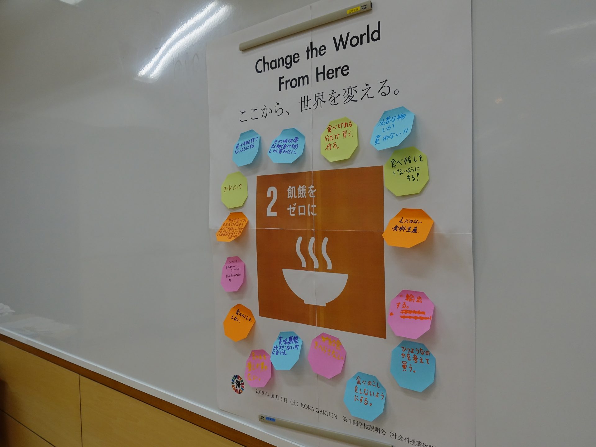 中学3年生による司会のもと、大陸ごとの人口と食料の比率の違いを考えるゲームを行い、食料の偏りについて考えました。その後、飢餓を解決するために、自分たちができることについて考え、一つの作品を作りました。