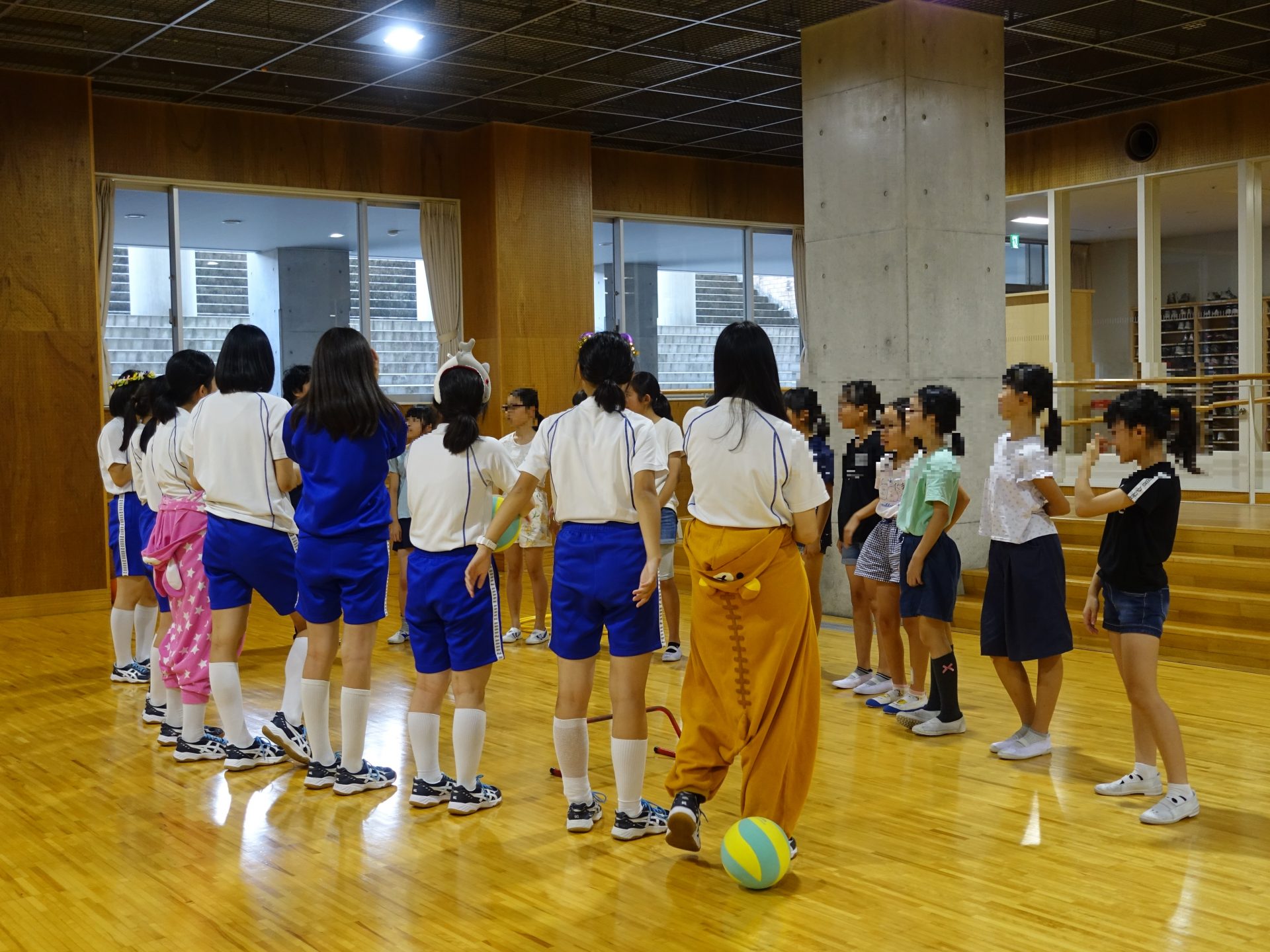 中学3年生の体育委員が考えたスポーツイベントを行いました。最後には仮装した中学3年生と、ドリブルリレーの競争をして楽しみました。