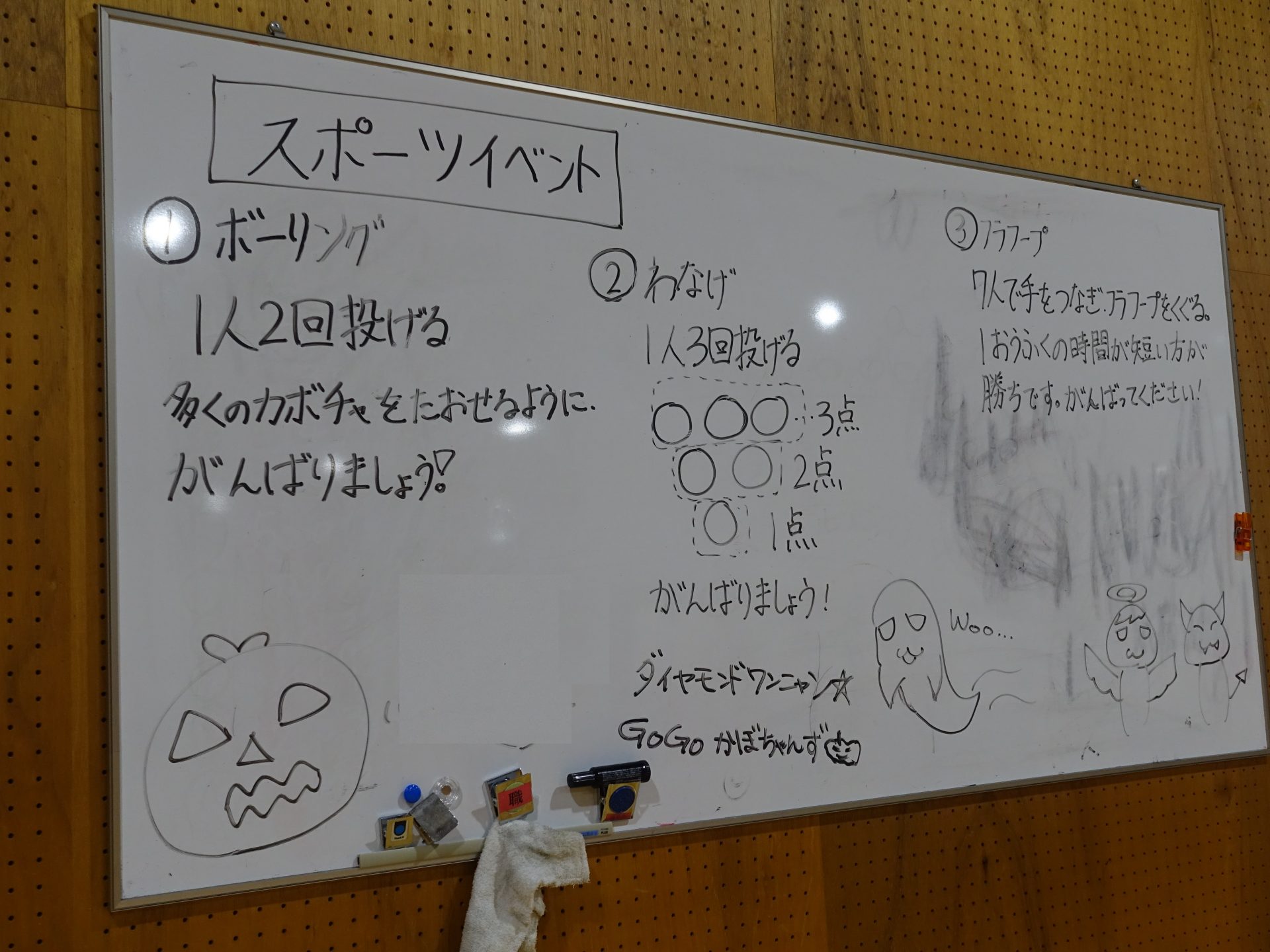 ハロウィンの仮面を作り、魔女になって風船をほうきで掃くゲームを行いました。最後にハロウィンにまつわる英単語を使って、ビンゴゲームを行いました。