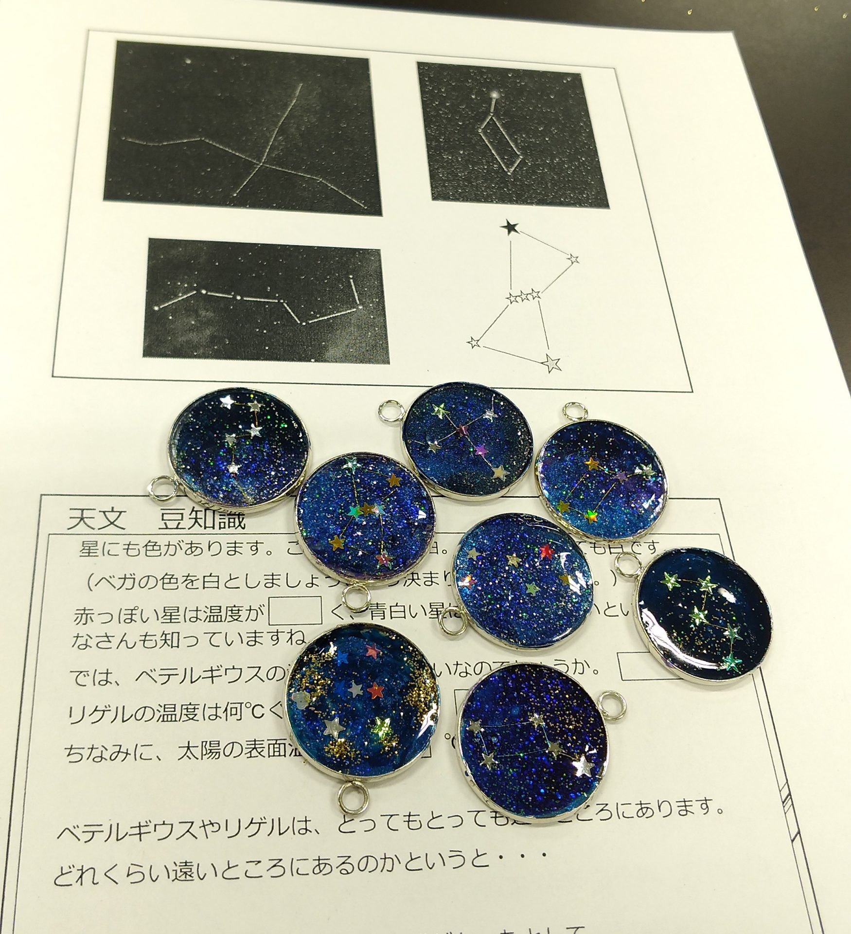 星座の勉強をした後、レジンを使って星座のアクセサリーを作りました。終わった後に天文同好会の説明も行いました。