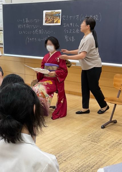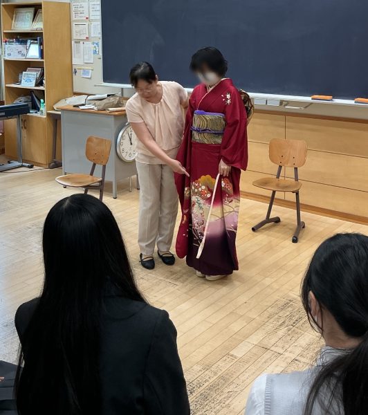 二十歳の集いは、任意参加のイベントで服装の指定はありませんから、振袖以外にもスーツで参加する人、海外留学に行っていて参加しない卒業生もいます。ただ、実際には多くの生徒が振袖を着てきます。そこで、着物での立ち居振る舞いについて、実際に着用した姿を見せながら説明しました。
