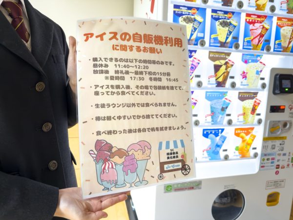 導入の最大の「壁」は、「綺麗な校舎が汚れること」でした。そこで生徒たちは、アイスを食べられる時間と場所を限定。さらに動線を明確にするなど、ルールを策定しました。そして、ルールが形骸化しないように、美化委員と規律委員の生徒を当番制で配置するようにしました。