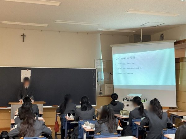 先日、ロングホームルームの時間に、中学1年生は中学3年生の「課題研究論文」の中間発表を聞きました。