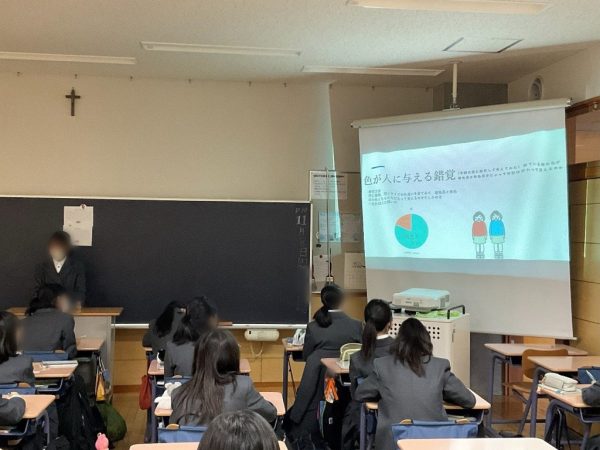 先日、ロングホームルームの時間に、中学1年生は中学3年生の「課題研究論文」の中間発表を聞きました。