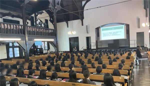 冒頭に、在校生による大学生活全般に対するガイダンスが行われました。大学でどのような学びを得ているか、高校でどのように進路選択を行ったかなど、中学3年生にとって大変貴重な話をしてくださいました。雰囲気のある華やかな講堂で行われたガイダンスに、生徒たちは真剣に耳を傾けていました。